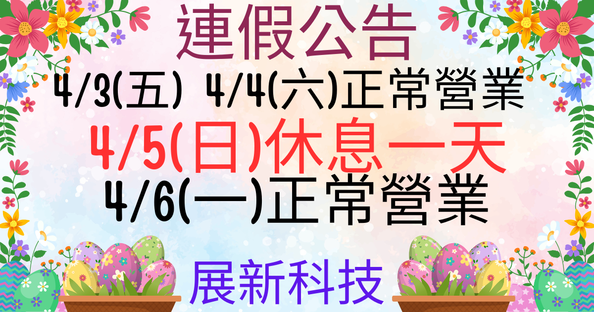 4月份連假正常營業 4/3(五) 4/4(六)正常營業 4/5(日)公休一天 4/6(一)起正常營業!