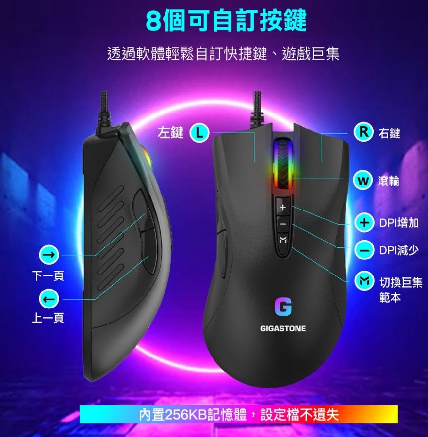 5.多功能自訂軟體,可調整DPI、RGB燈光、快捷鍵等功能;內建256KB記憶體,設定不遺失