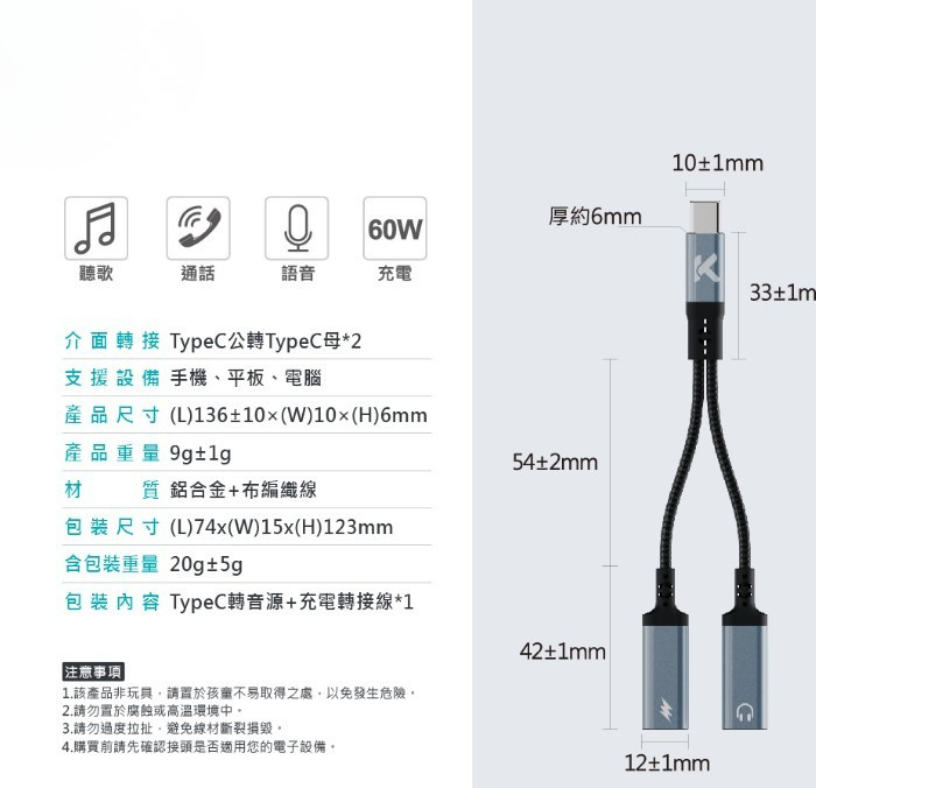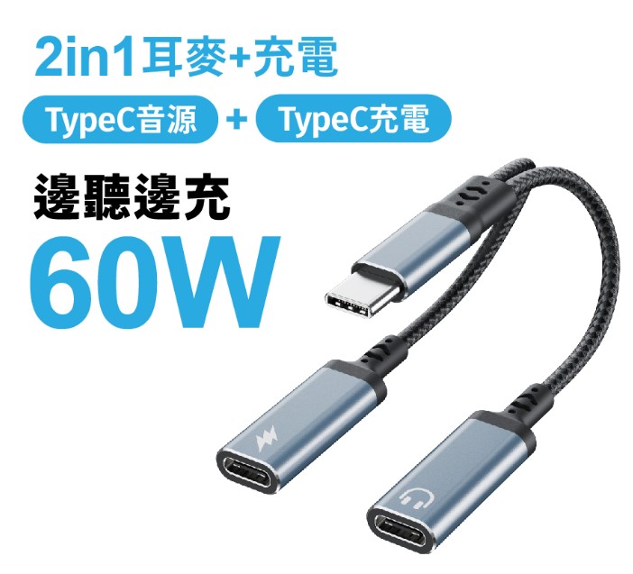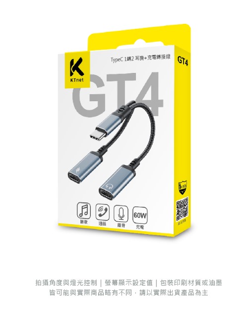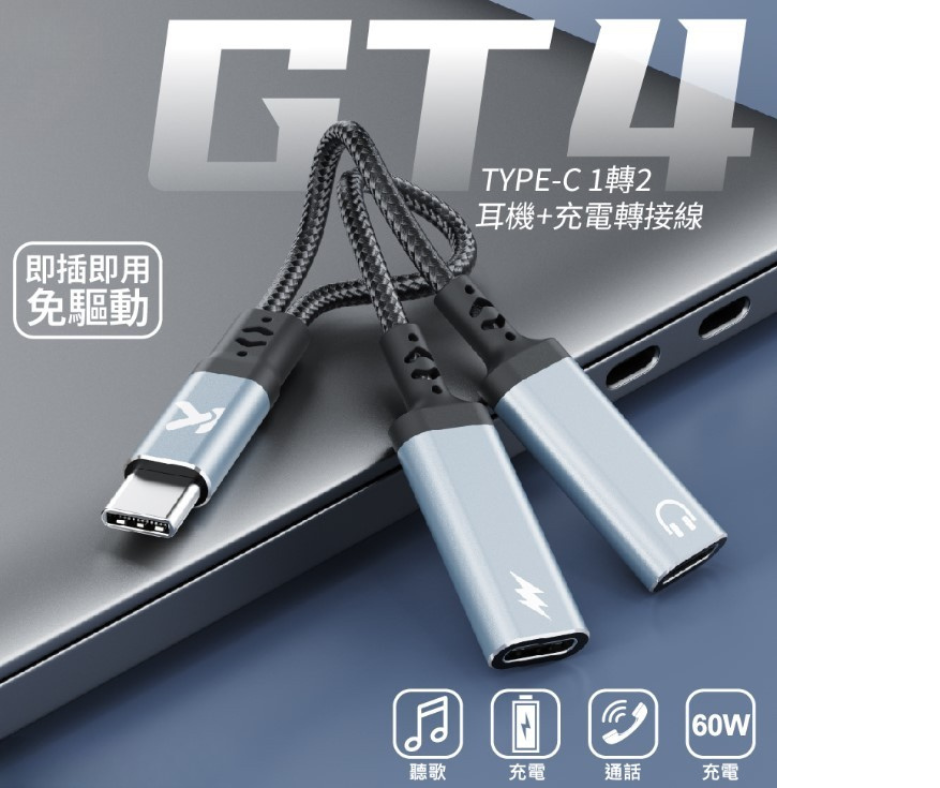 ◆產品名稱:GT4 TypeC 1轉2耳麥+60W充電轉接線10CM