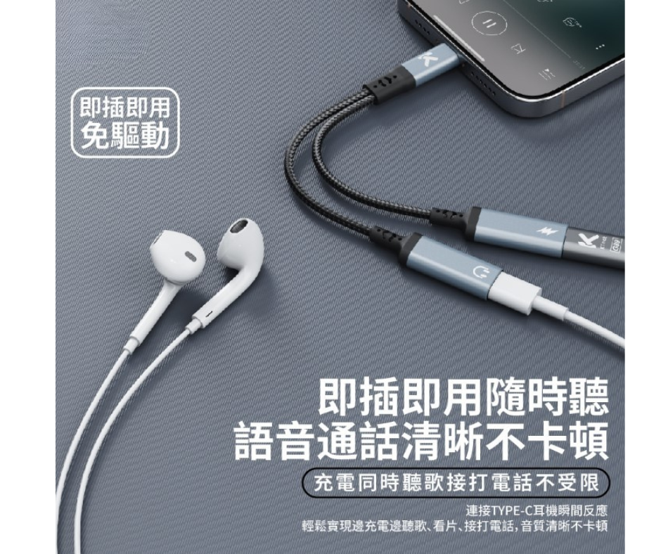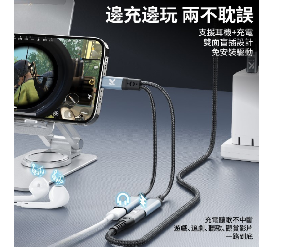 ■Type-C雙功能轉接線,支援耳機+充電、雙面盲插設計、免安裝驅動