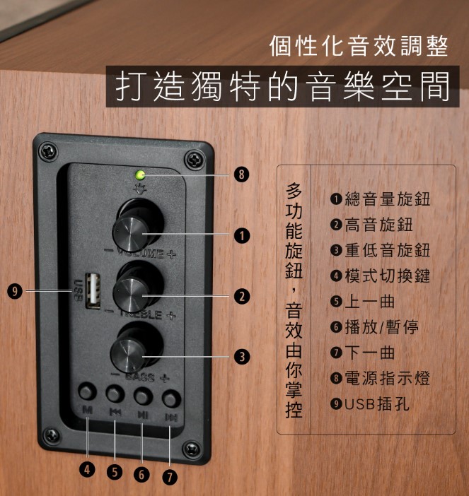 *多功能旋鈕設計,輕鬆調節音量、高音與低音,音效由你掌控