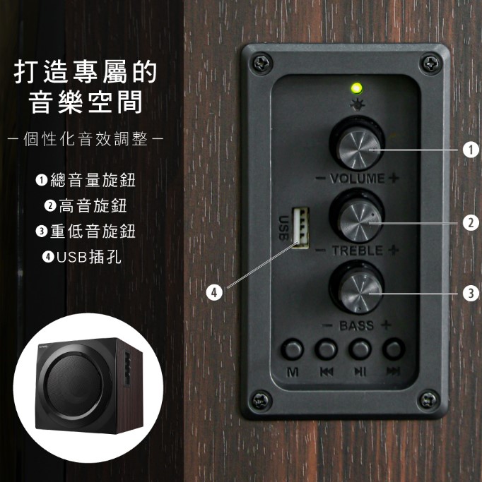 *多功能旋鈕設計,輕鬆調節音量、高音與低音,音效由你掌控